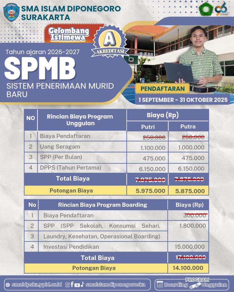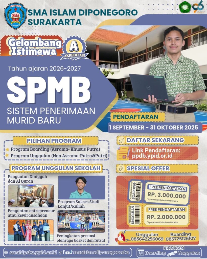 SMA Islam Diponegoro Surakarta Program Boarding merupakan salah satu layanan program pendidikan dari Yayasan Pendidikan Islam Diponegoro (YPID) Surakarta untuk tahun ajaran 2025/2026 yang diperuntukan khusus untuk Siswa Putra. Program Boarding ini menggabungkan kurikulum nasional dan kurikulum diniyah (agama) menjadi sebuah kurikulum visioner berorientasi global yang dalam pelaksanaannya didukung oleh keunggulan :